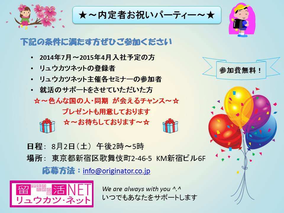 【参加費用】無料(内定のご褒美として、リュウカツ・ネ ットが招待いたします♪)